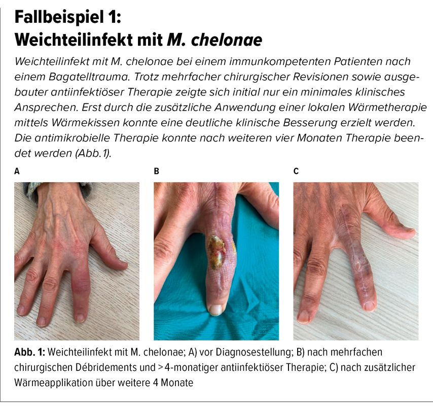 Bei Haut- und Weichteilinfektionen mit hitzesensitiven Mykobakterien kann eine lokale Wärmetherapie in Erwägung gezogen werden. Diese auf Fallserien basierende Therapiemethode berücksichtigt die mikrobiologische Eigenschaft bestimmter Mykobakterien, sich bei Temperaturen über 37°C nicht mehr vermehren zu können. Die lokale Applikation von Wärme, beispielsweise durch Wärmekissen, kann somit wesentlich zum Therapieansprechen beitragen (vgl. Fallbeispiel 1).