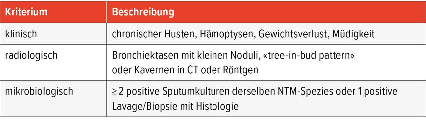 Die Diagnose einer pulmonalen NTM-Erkrankung erfordert laut IDSA/ATS-Kriterien das Vorliegen klinischer Symptome (ggf. zusätzlich zu einer Grunderkrankung), typische radiologische Auffälligkeiten und eine mikrobiologische Bestätigung (Tab.1). Wichtig ist die Abgrenzung der NTM-Erkrankung von der Kolonisation und der transienten Infektion, da NTM auch zufällig bei asymptomatischen Patient:innen isoliert werden können. Ein mehrfacher respiratorischer NTM-Nachweis macht ein spontanes Verschwinden unwahrscheinlich. Die Diagnose einer NTM-Erkrankung muss nicht zwingend zu einer Therapie führen und muss in Abhängigkeit von Progredienz, potenziellen Nebenwirkungen und Interaktionen entschieden werden. Diese Schwierigkeiten müssen den Patient:innen kommuniziert werden und die Entscheidung für oder gegen eine Therapie muss zusammen mit ihnen getroffen werden im Sinne eines «shared decision-making».