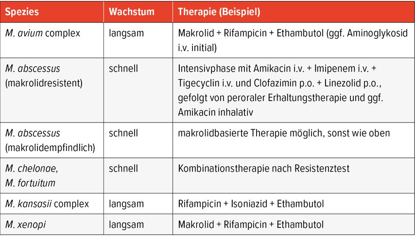 Die Behandlung ist langwierig und basiert auf In-vitro-Empfindlichkeitsprüfungen. Bei pulmonalen Infektionen wird in der Regel eine Therapie für ≥12 Monate nach Kulturnegativierung empfohlen. Auch bei chirurgisch sanierten Weichteilinfektionen ist eine antiinfektiöse Therapie für Monate indiziert. Die optimale Zusammenstellung sowie auch Applikation (intravenös versus peroral und inhalativ; täglich versus intermittierend) variieren stark je nach Spezies, Manifestation und Ausprägung der Erkrankung. Die Therapieempfehlungen für pulmonale NTM-Infektionen basieren auf den Guidelines der ATS/ERS/ESCMID/IDSA. Für extrapulmonale Infektionen existieren oft keine klaren Therapieempfehlungen, sondern sie basieren auf Expertenmeinungen. Eine der obersten Prioritäten ist, die Resistenzentstehung (vor allem Makrolidresistenz) zu vermeiden. Deshalb sollten nie Monotherapien verabreicht werden.