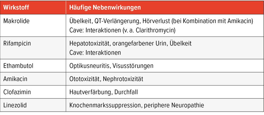 Im Folgenden werden Therapieoptionen für klinisch relevante NTM-Spezies erörtert. Eine Übersicht über die empfohlenen Regime sowie die häufigsten Nebenwirkungen findet sich in Tabelle 2 bzw. Tabelle 3.