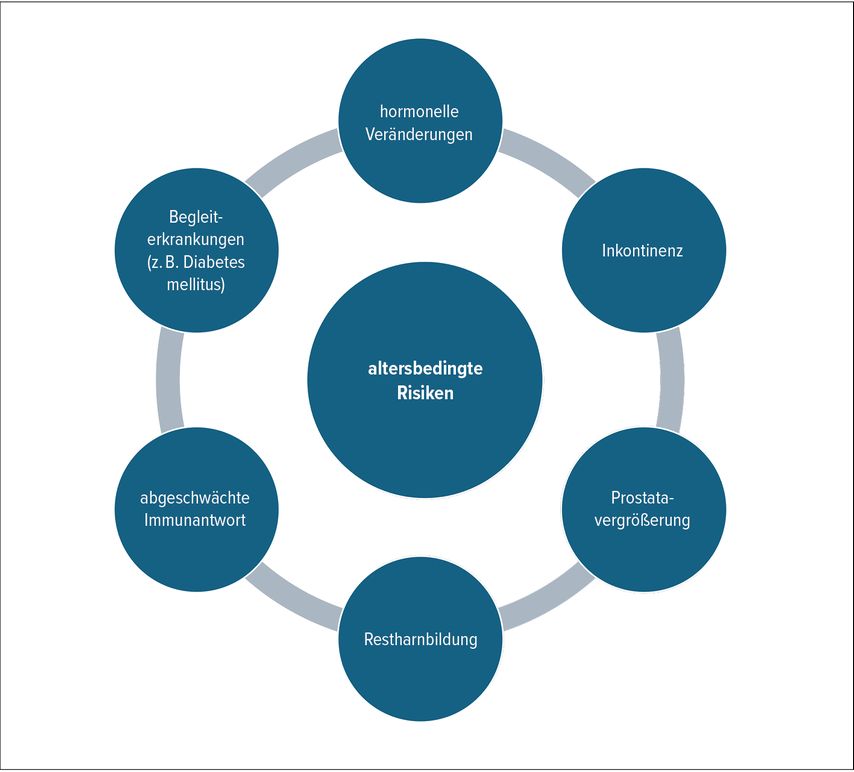 Im Alter verändern sich Schleimhäute, Blasenfunktion und Immunabwehr. Die Harnblasenmuskulatur wird weniger elastisch (Compliance) und die Restharnmenge kann steigen, was das Risiko für Infektionen erhöht. Zudem sind häufig Begleiterkrankungen wie Diabetes mellitus, Prostatavergrößerung oder Inkontinenz vorhanden, die die Infektanfälligkeit erhöhen. Als Infekttrigger sind besonders Glukosurie-fördernde Medikamente wie Empaglifozin und Dapaglifozin zu erwähnen. Die Symptome sind häufig anders als bei jungen Patient:innen. So können eine neu aufgetretene Inkontinenz, eine Verschlechterung des Allgemeinzustandes mit Fieber und Erbrechen oder auch das Auftreten eines akuten Harnverhaltes auf eine Harnwegsinfektion hindeuten. Abbildung 1 zeigt die wichtigsten altersbedingten Risikofaktoren.