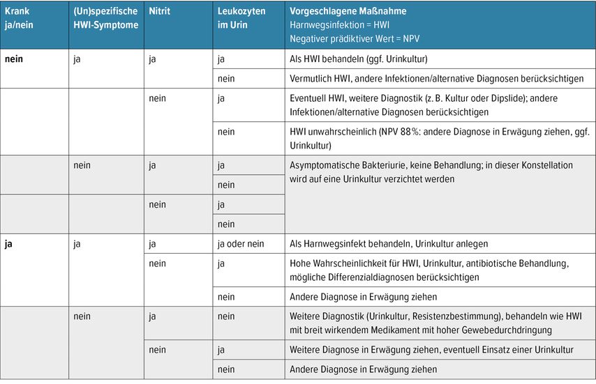 Tab. 1: Gestuftes Vorgehen bei Verdacht auf Harnwegsinfekt (HWI) bei geriatrischen Patienten (ohne Katheter) gemäß aktueller S3-Leitlinie Harnwegsinfektion