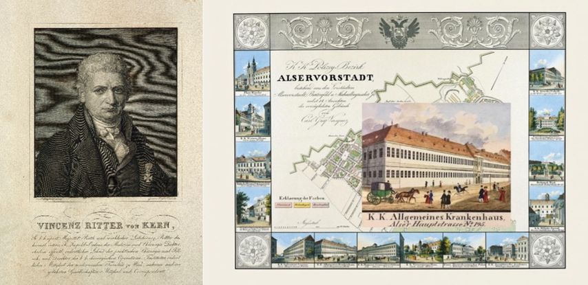 Abb. 1:A: Vincenz von Kern, Stich von Gustav Leybold (1794–1855); 1820. B: Bildmontage Allgemeines Krankenhaus, Alte Alser Hauptstraße 195, aus: Carl Vasquez (1798–1861): Pläne der Stadt Wien bzw. der Polizeibezirke innerhalb des Linienwalls nach 1830, hier Alservorstadt